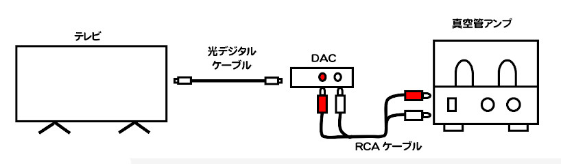 次にDACのアナログ出力からRCAケーブルで真空管アンプに接続することでテレビの音を真空管アンプで聴くことが出来るようになります。