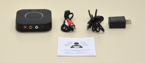 Bluetoothレシーバー本体の他RCAケーブル、電源ケーブル、電源アダプター、マニュアルなど一式入っています。