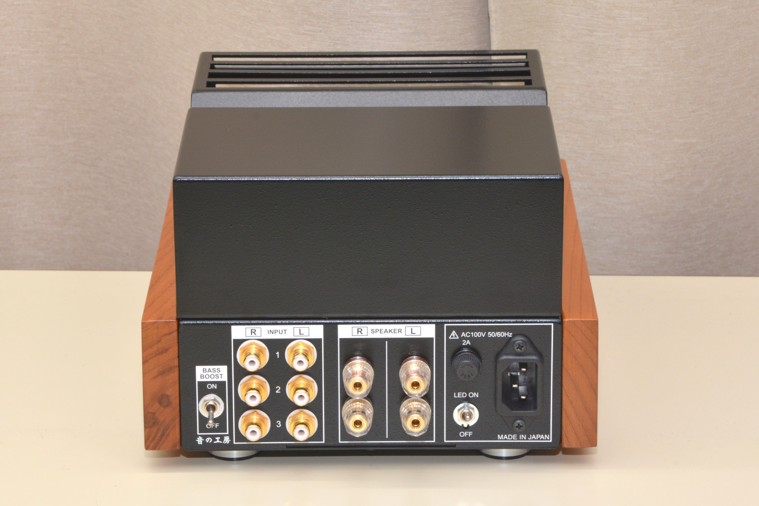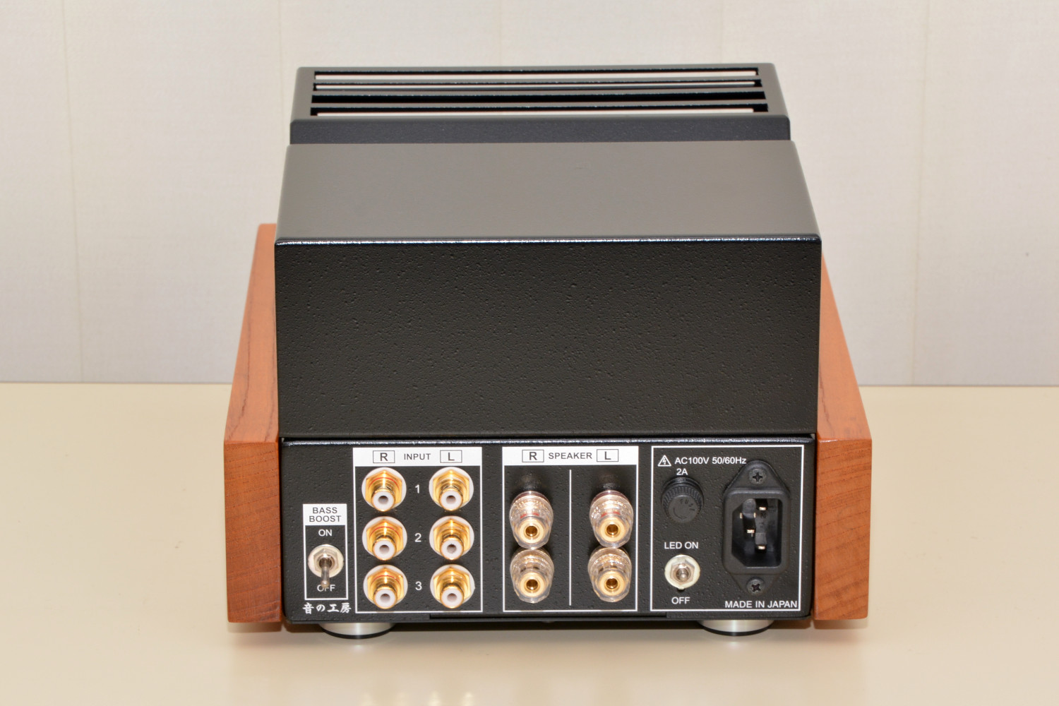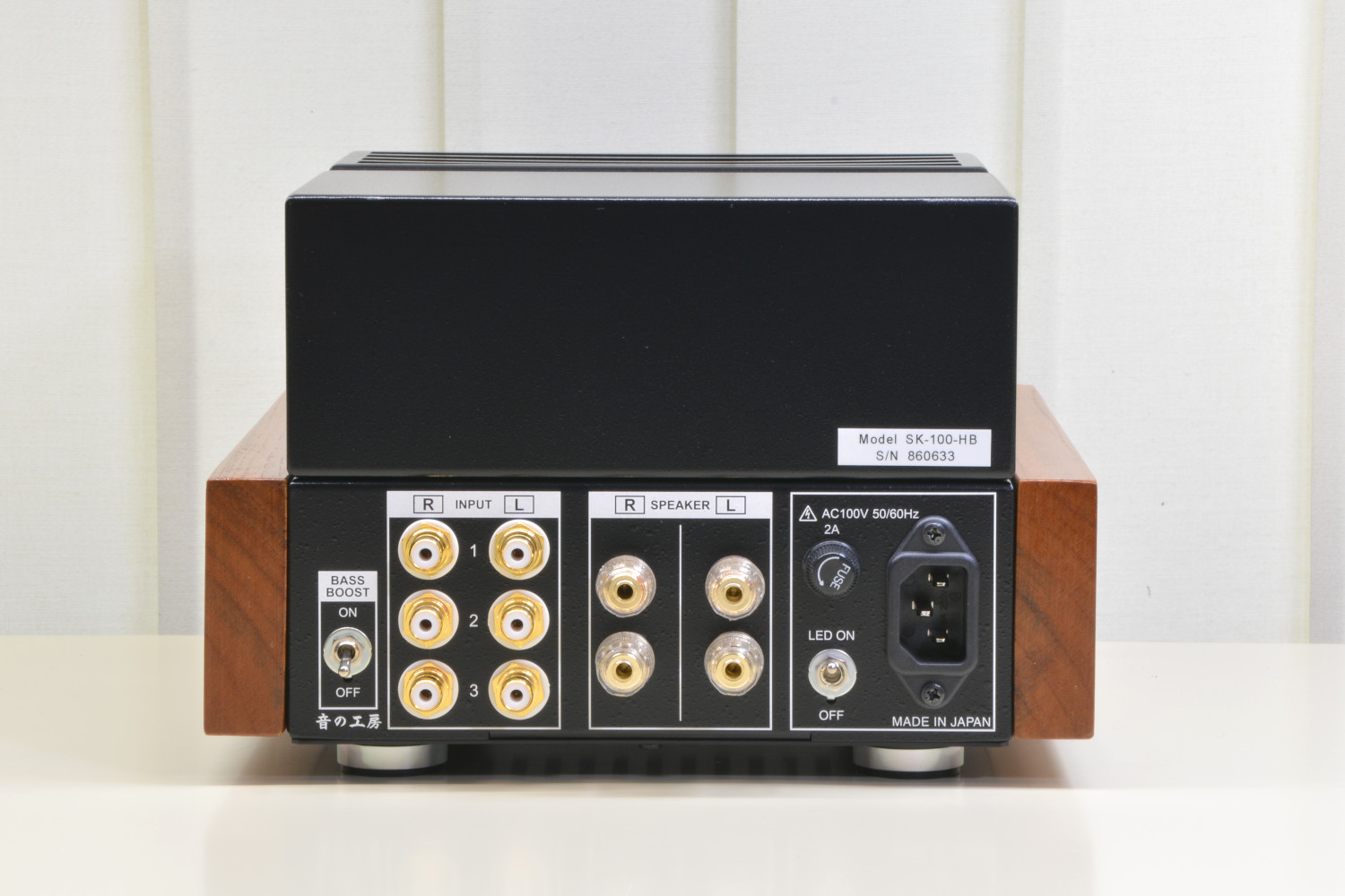 本品は音の工房で販売している真空管アンプキットの「SK-60KT」を音の工房が正式に製作・調整したものに、真空管保護カバーとサイドウッドを付けたものです。真空管アンプ「SK-100-HW」の3系統入力とセレクタースイッチが無い以外は回路も使用部品も同じ内容の製品です。